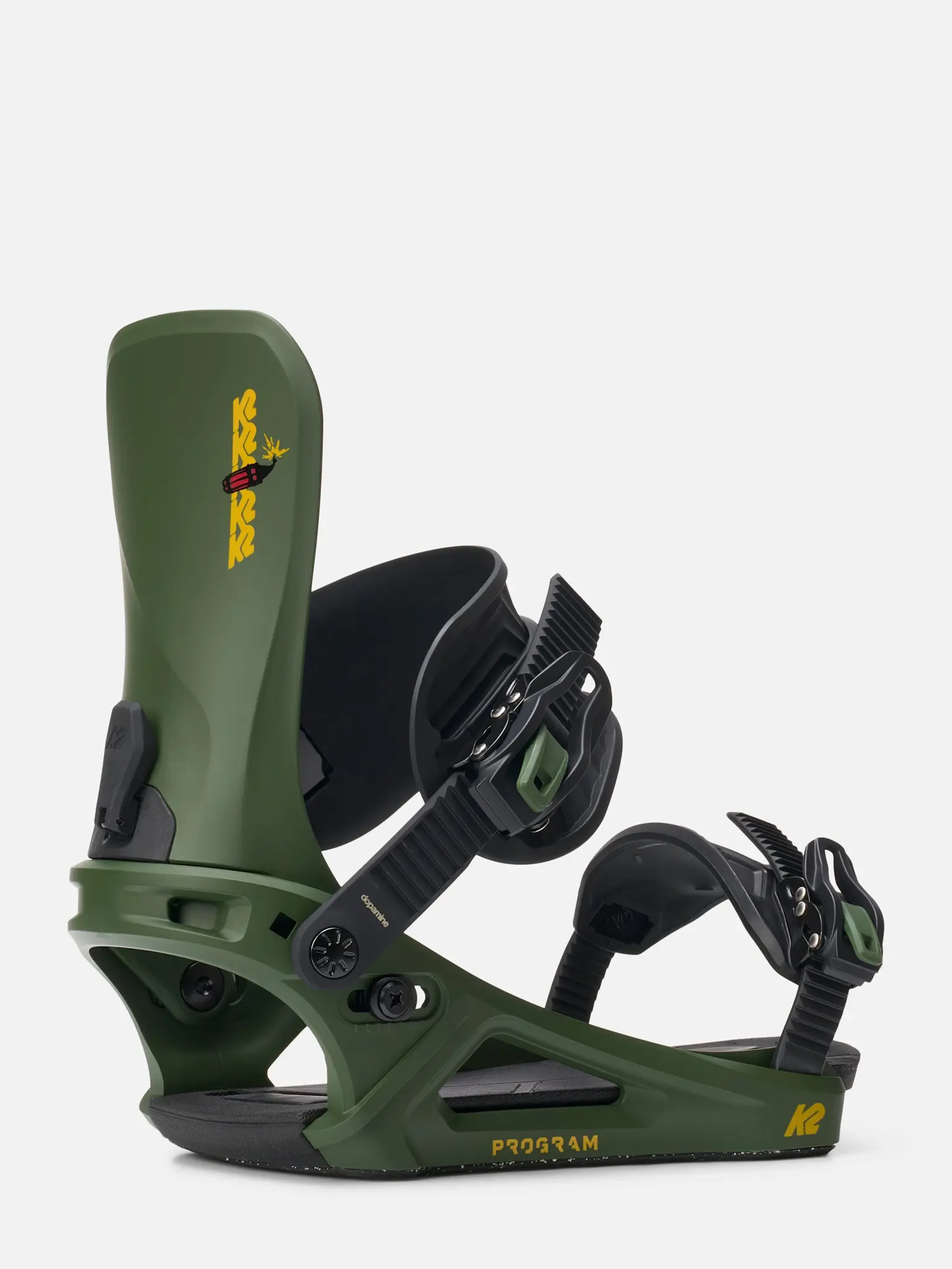 The K2 Program snowboard binding is a high-performance binding for the advanced-to-expert level snowboarder looking to take care of mother nature, without sacrificing performance. A 50% Glass filled nylon chassis is surrounded with castor-bean based materials, with a goal of reducing the size of a binding’s carbon footprint.By utilizing eco-conscious and recycled materials instead of plastics and EVA, we have made significant strides in sustainability. Our manufacturing process relies on over 40% solar-powered energy, and our packaging is FSC certified, utilizing cardboard and recycled paper instead of plastics.As a result, we have achieved impressive reductions in our binding footprints – it’s not perfect, but it’s a click in the right direction:• The Program binding uses ~40% Bio-based material by volume and ~25% by weight.• DD1 Ankle Strap and BetterWrap Toe Straps have seen a 70% reduction in CO2 emissions per kg when compared to traditional TPU straps.• The castor-bean-based FR1 Highback offers ~a 40% reduction in CO2 emissions per kg when compared to a nylon highback.• Sugarcane EVA Shockpad offers a ~90% reduction in CO2 emissions per kg when compared to traditional EVA.• All K2 Snowboarding bindings come in 100% Recyclable Packaging.• All K2 Snowboarding binding packaging is 95% FSC-certified recycled material.• >40% of the energy used in our manufacturing process is derived from solar.